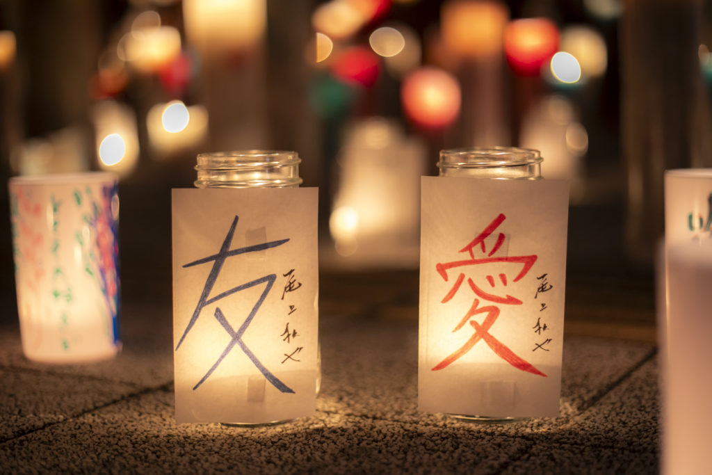 双葉駅前で灯すキャンドルには、JCA直営校・認定校の生徒の皆さまからお寄せいただいたメッセージも並びます。