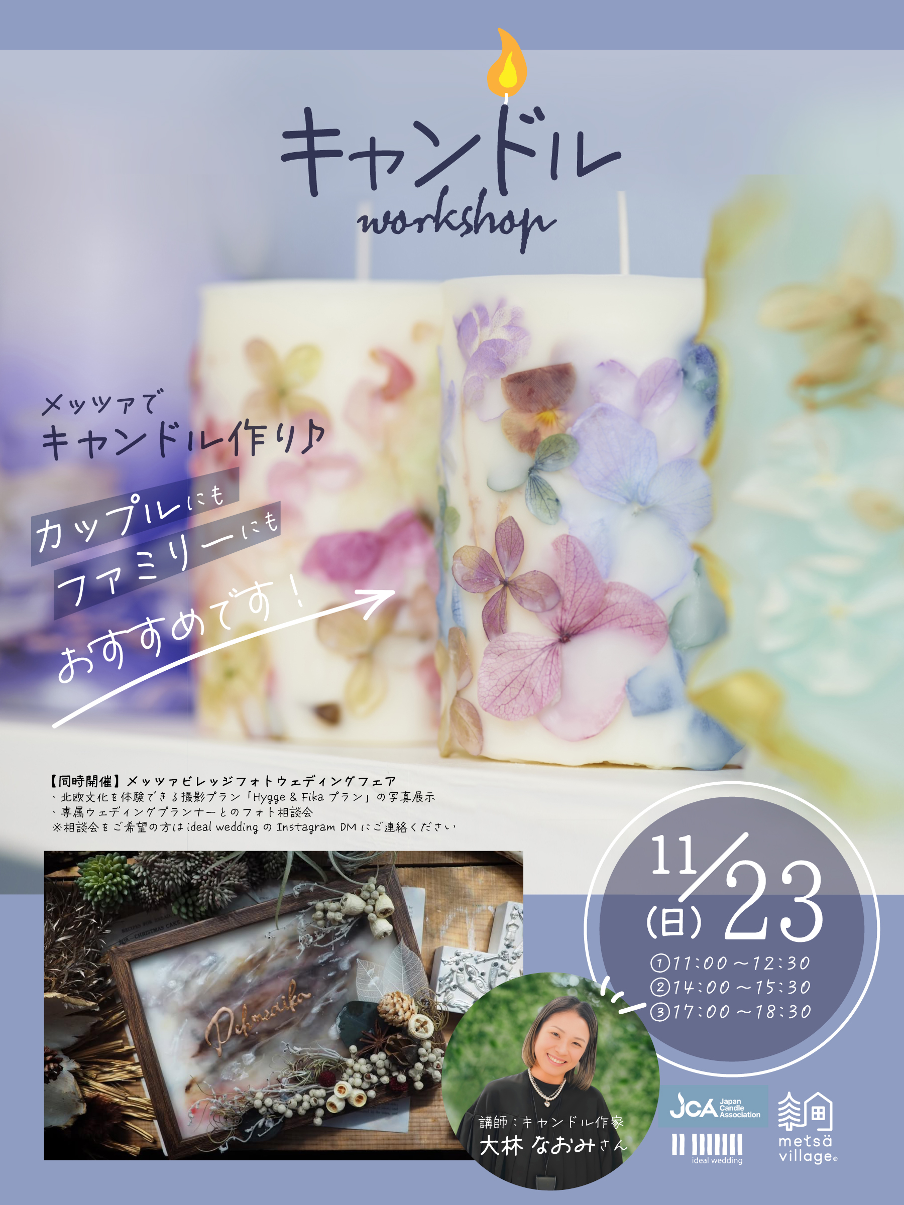 | 参加費 | ①②ボタニカルキャンドル 3,500円(税込) ③ウェルカムボードキャンドル 5,000円(税込) ※当日精算(現金のみ) |