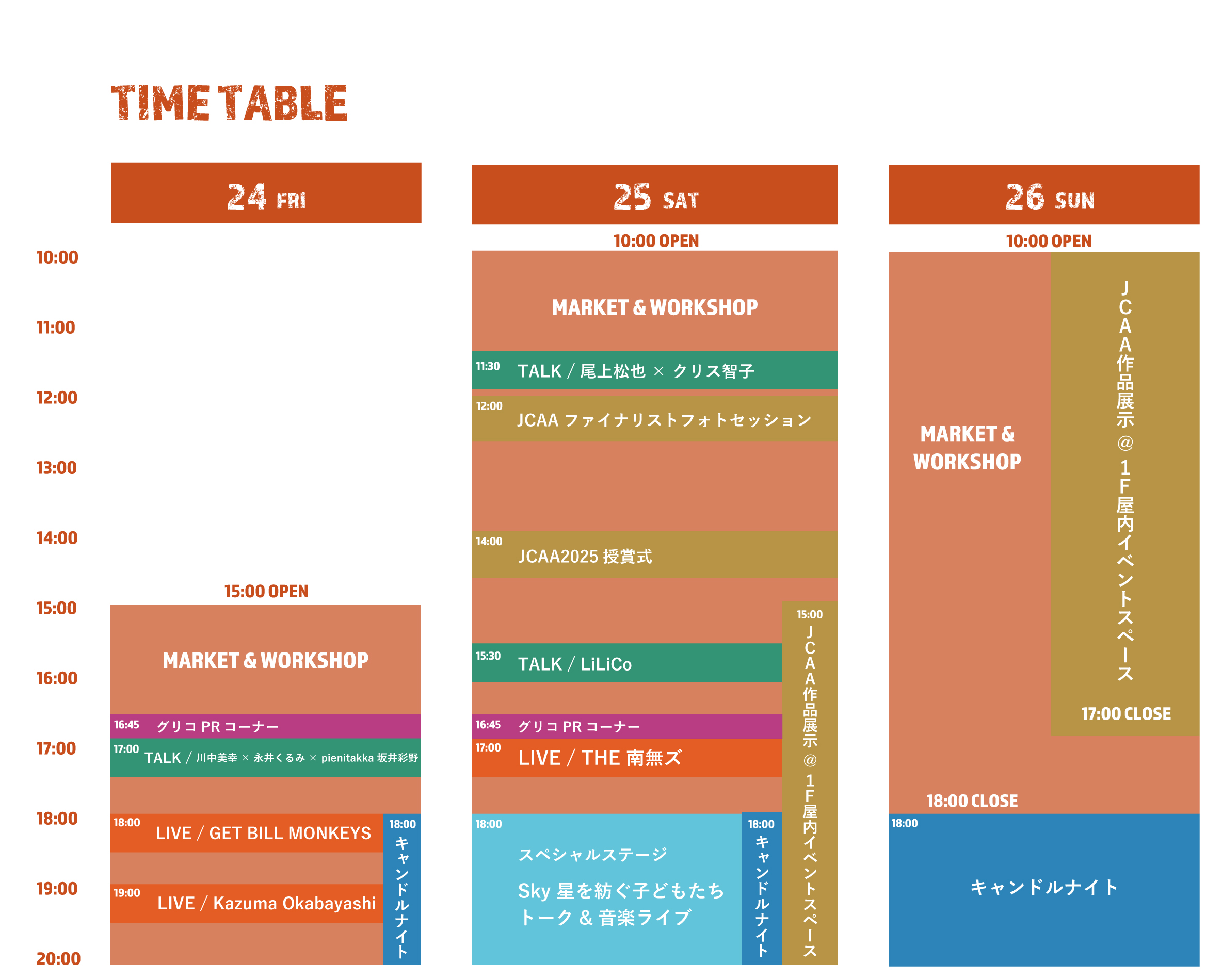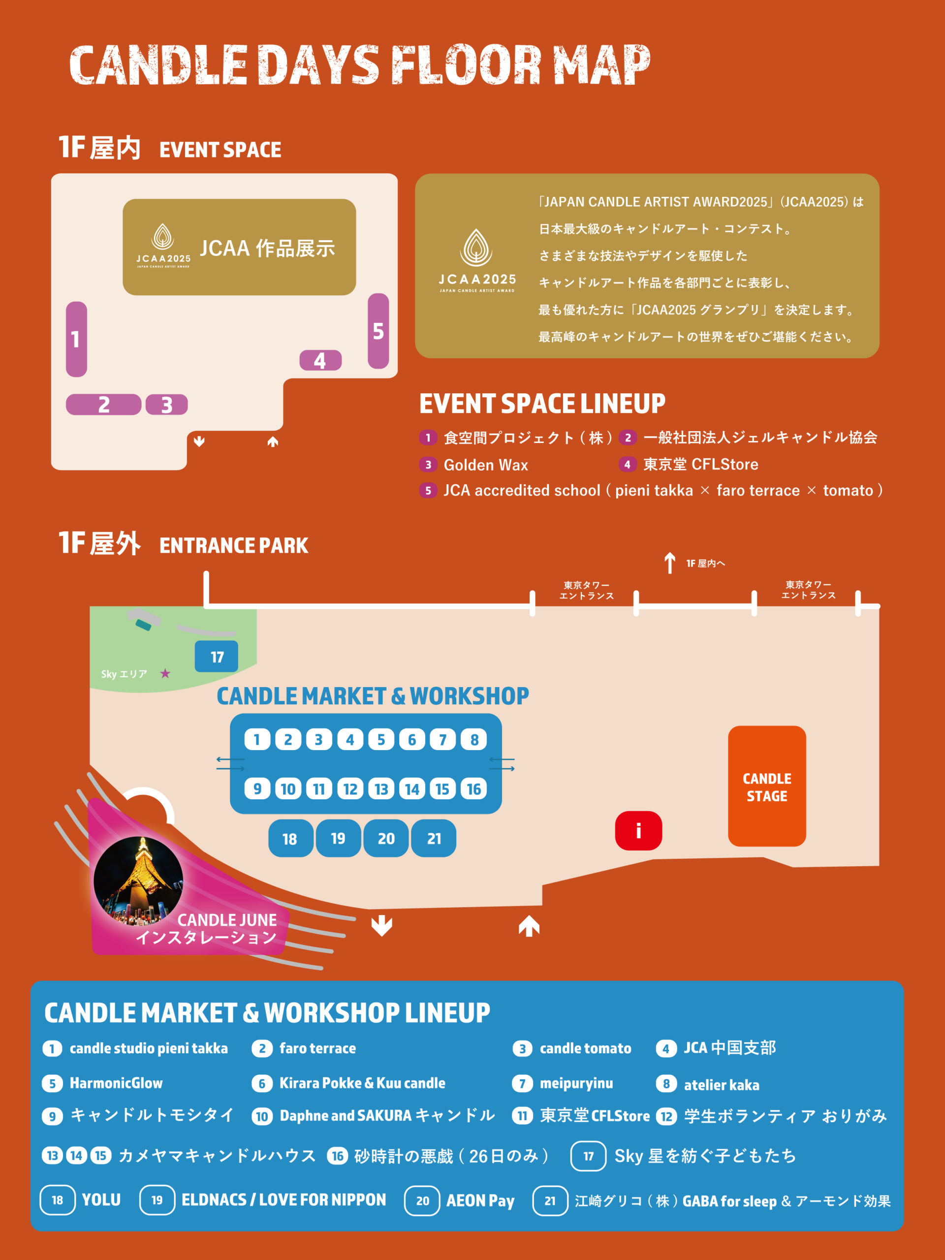 東京タワーが“キャンドルの灯り”に包まれる3日間。 東京タワーという特別な場所で、灯り・体験・作品・音楽がひとつにつながる3日間となりました。会期中は雨の降る日も多い開催となりましたが、キャンドルのゆらぎが来場者の皆さまの心をそっとほどき、心あたたまる特別な時間を生み出せたことに深く感謝しております。 また、CANDLE JUNEによるインスタレーションに加え、「Sky 星を紡ぐ子どもたち」のインスタレーションも多くの方で賑わい、会場をより一層魅力的に彩りました。ご来場の皆さま、出展者・出演者の皆さま、関係各社の皆さまのご協力により、今年もキャンドルづくしの3日間を実現することができました。来年も、さらに心に残る時間をお届けできるよう準備してまいります。 CANDLE STAGE 灯りに包まれた特設ステージでは、トークと音楽がキャンドルのゆらぎと重なり、会場全体が穏やかな一体感に包まれました。雨天の時間帯もありましたが、足を止めて耳を傾けてくださる方も多く、灯りとともに過ごすステージの魅力を改めて感じるひとときとなりました。キャンドルを愛する人々の言葉や音が、来場者の皆さまにとって「今日の思い出」だけでなく、「また灯したくなる気持ち」へとつながっていれば幸いです。 TOKYO TOWER CANDLE NIGHT 東京タワーのライトアップと連動し、無数のキャンドルを一斉に灯す「キャンドルナイト」は、今年も圧巻の光景となりました。雨の中でも灯りが揺らめく景色は幻想的で、東京タワーでしか味わえない唯一無二の体験として、多くの方にお楽しみいただきました。メッセージキャンドルに込められた想いもまた会場を静かに満たし、灯りが人の気持ちをつなげる力を実感する時間となりました。 CANDLE MARKET & WORKSHOP キャンドルマーケット&ワークショップでは、手作りならではの温もりと多様な表現に出会う場となりました。雨天でも会場には多くの方が足を運んでくださり、作品を「選ぶ」「贈る」「飾る」楽しさに加え、ワークショップでは自分の手で作る体験が、キャンドルをより身近に感じるきっかけになったと感じています。作り手の想いが伝わるコミュニケーションが生まれ、キャンドル文化の広がりを実感する時間となりました。 JAPAN CANDLE ARTIST AWARD 2025 今年のJCAAは、日本全国およびアジア各国から集まったアーティストの作品が一堂に会し、さらにレベルアップした作品が並ぶ展示となりました。技術・創造性・表現力が交差する作品群は、キャンドルがアートとして持つ可能性を改めて示してくれました。授賞式や展示、アーティストによるマーケットを通して、作り手の挑戦と来場者の感動がつながる、意義深いアワードとなりました。 詳しくはこちらをご覧くださいhttps://japan-candle.org/jcaa-2025/ 賛助企業:江崎グリコ株式会社 セールス本部 第一セールス部 首都圏エリア支店 / 大和ハウス工業株式会社後援:一社)アートキャンドル協会 / 一社)ジェルキャンドル協会 / 一社)港区観光協会 / 食空間プロジェクト株式会社主催:一社) 日本キャンドル協会 / 株式会社JCA ARCHIVE